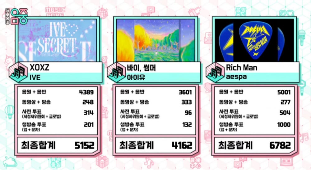 aespa’s “Rich Man” earned a total of 6,782 points, surpassing IVE’s “XOXZ” with 5,152 points and IU’s “Bye, Summer” with 4,162 points, securing the top spot even without IU or IVE appearing on the show that day.