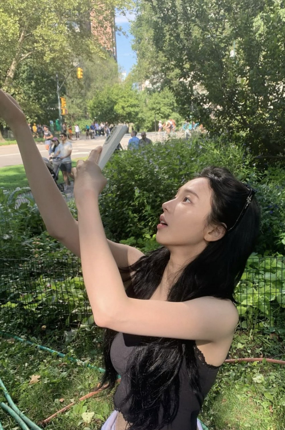 Her naturally flowing waves framed her face softly, giving off an effortless, star-like aura that fits perfectly into everyday life. The front bangs revealing her forehead, paired with the voluminous yet casually tousled hairstyle, harmonized beautifully with New York’s free-spirited vibe.