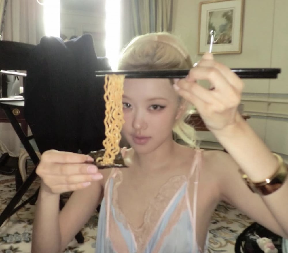 However, one unexpected photo captured fans’ hearts the most—a shot of Rosé sitting on the floor, casually eating ramyeon. The candid moment highlighted her humble, down-to-earth side, contrasting beautifully with her glamorous styling.