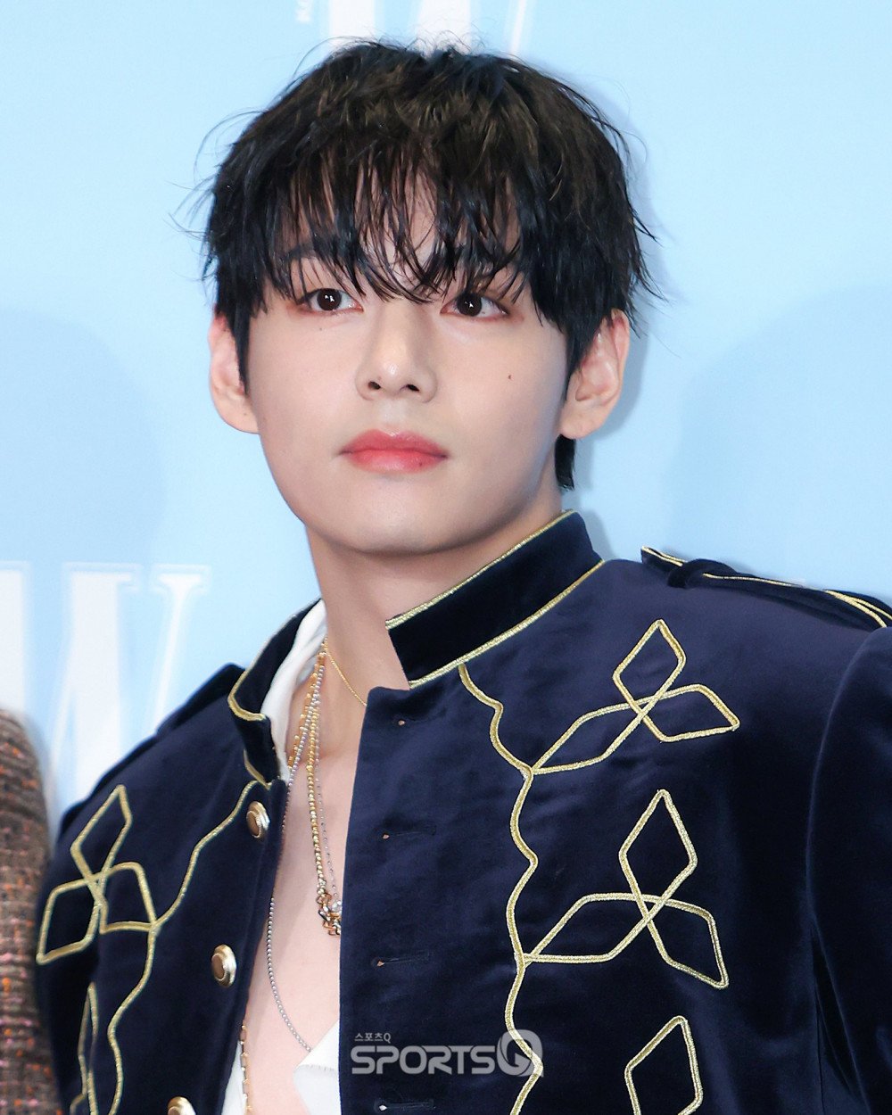 Taehyung wore a striking navy velvet military-style jacket with elaborate gold embroidered detailing. Underneath, he has on a white ruffled shirt left partially unbuttoned, accessorized with several layered Cartier necklaces, and the outfit is completed with denim jeans.