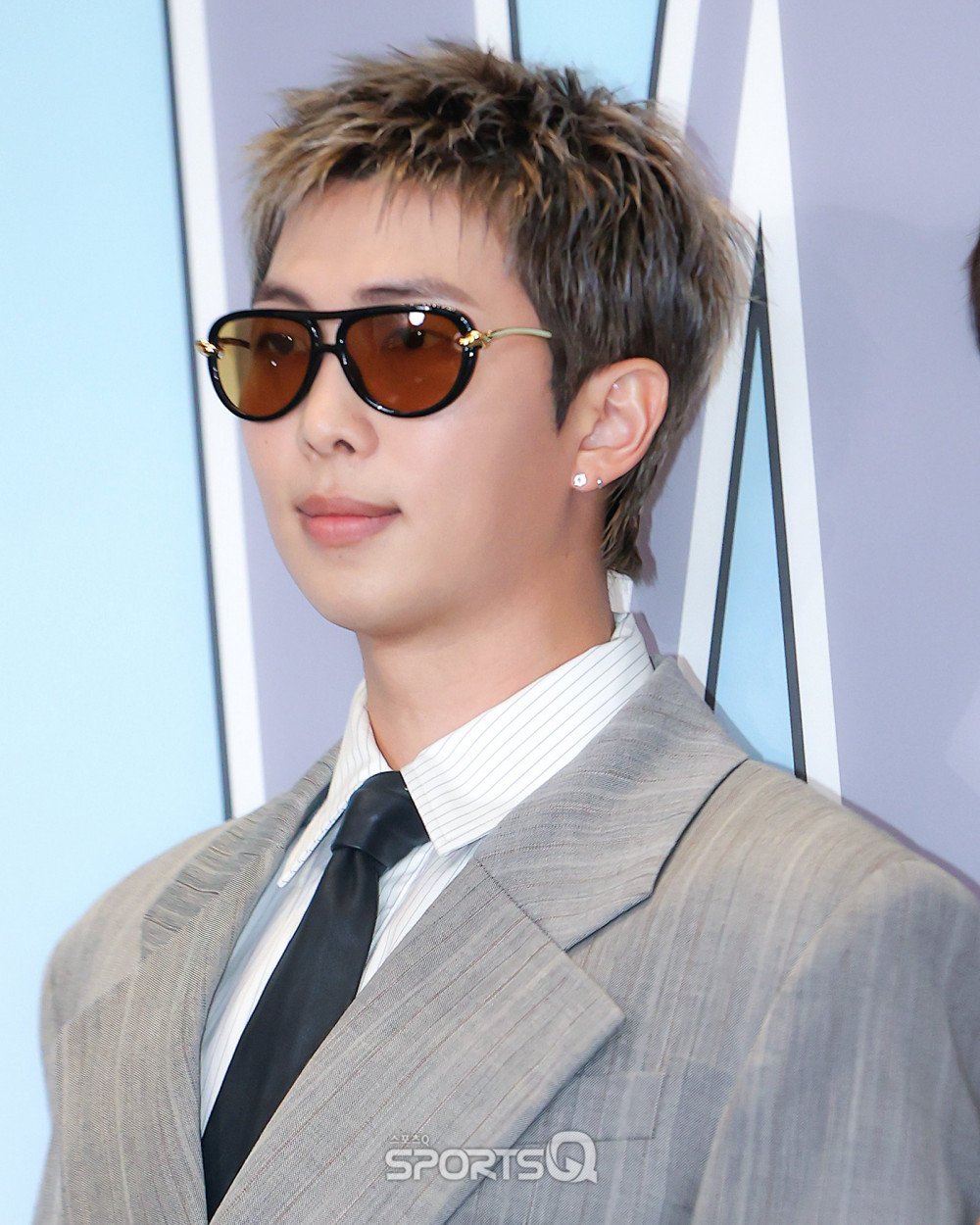 RM wore a stylish grey double-breasted suit with wide lapels and black buttons. He pairs the suit with a light-colored striped dress shirt and a solid black necktie, completing the look with dark-lensed sunglasses.