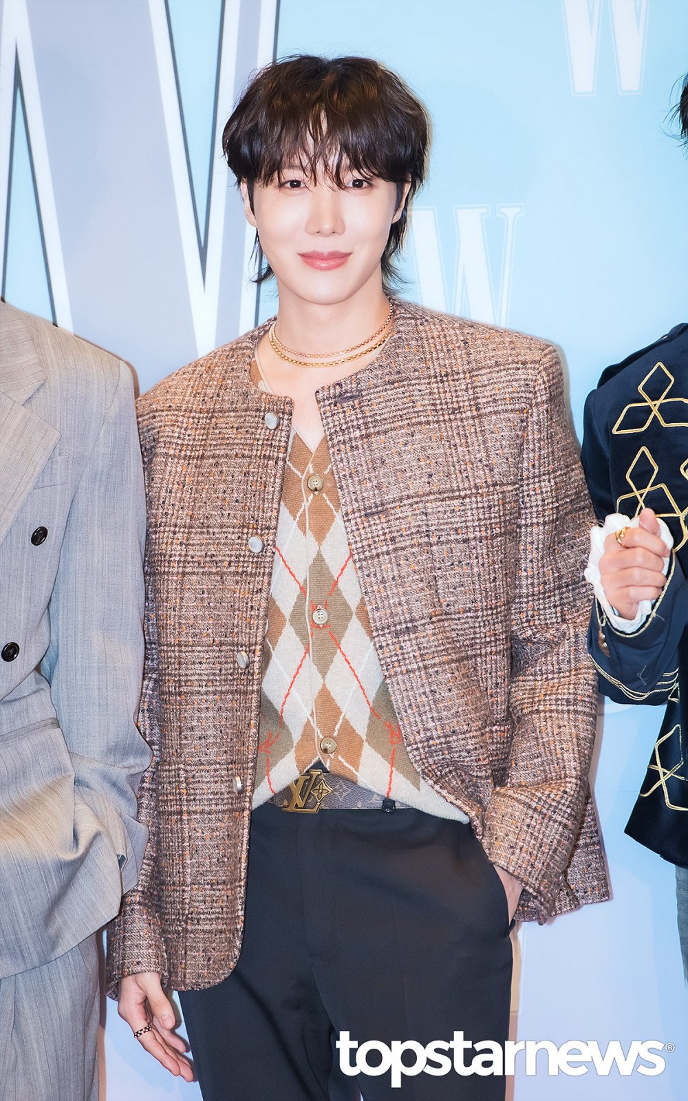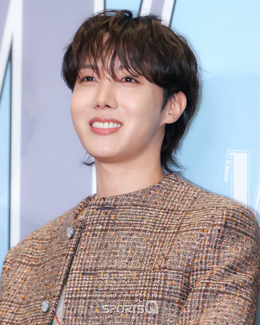 J-Hope wore a brown tweed blazer over a cardigan in shades of brown, beige, and orange. He paired this with dark trousers and a dark belt with a large gold buckle.