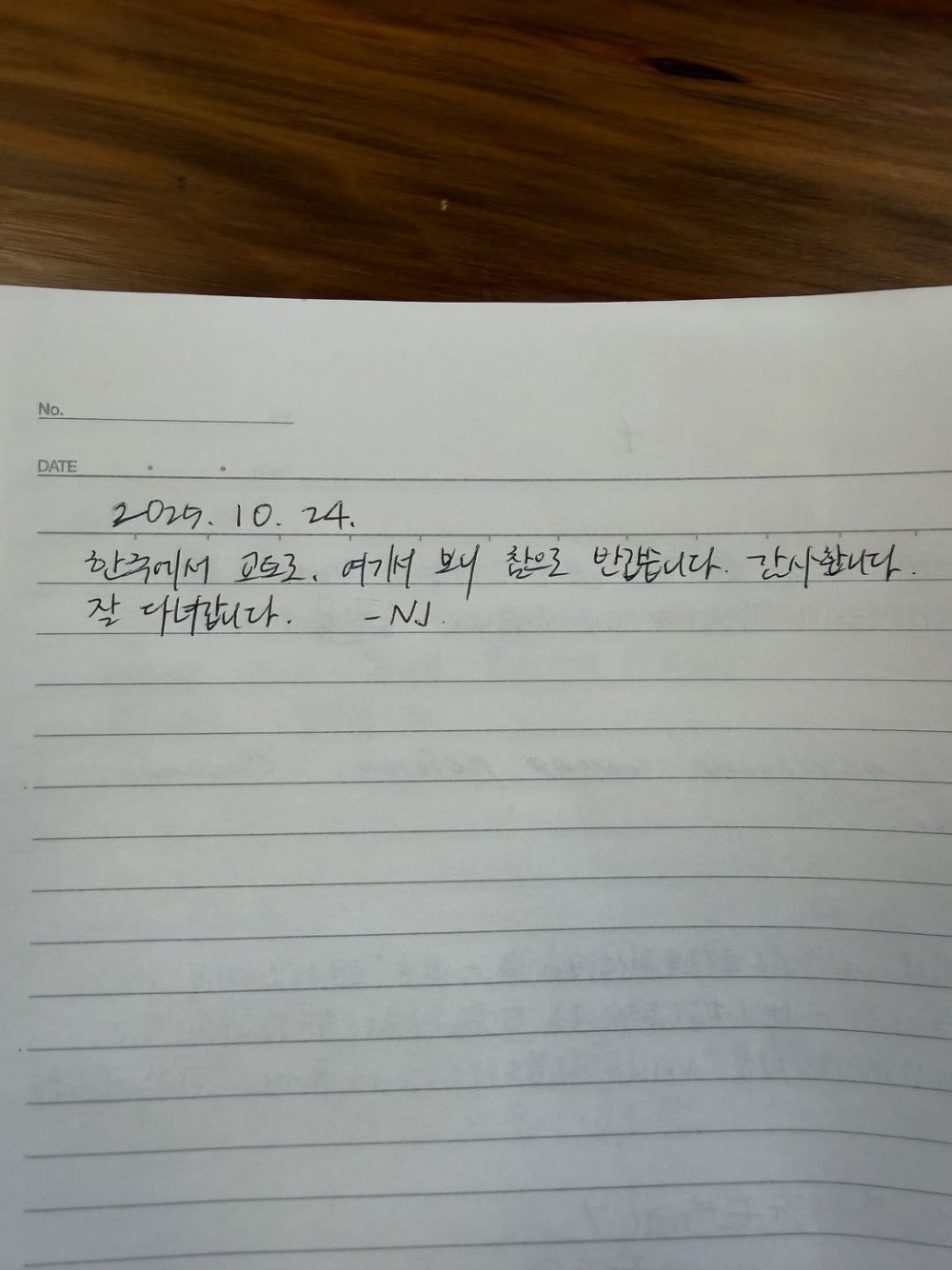 In one of the photos, RM wrote a message dated October 24 in a visitor's book that reads: "From Korea to Kyoto. It's pleasant to see it here. Thank you. It was a great visit. -NJ"