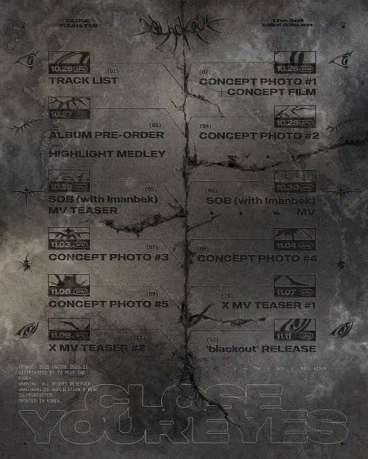 Close Your Eyes revealed the full tracklist for its third mini-album ‘blackout’, setting off global buzz with the disclosure of double title tracks ‘X’ and ‘SOB (with Imanbek)’. The list dropped on the group’s official social channels on Oct. 25, 2025, 8 p.m. KST.