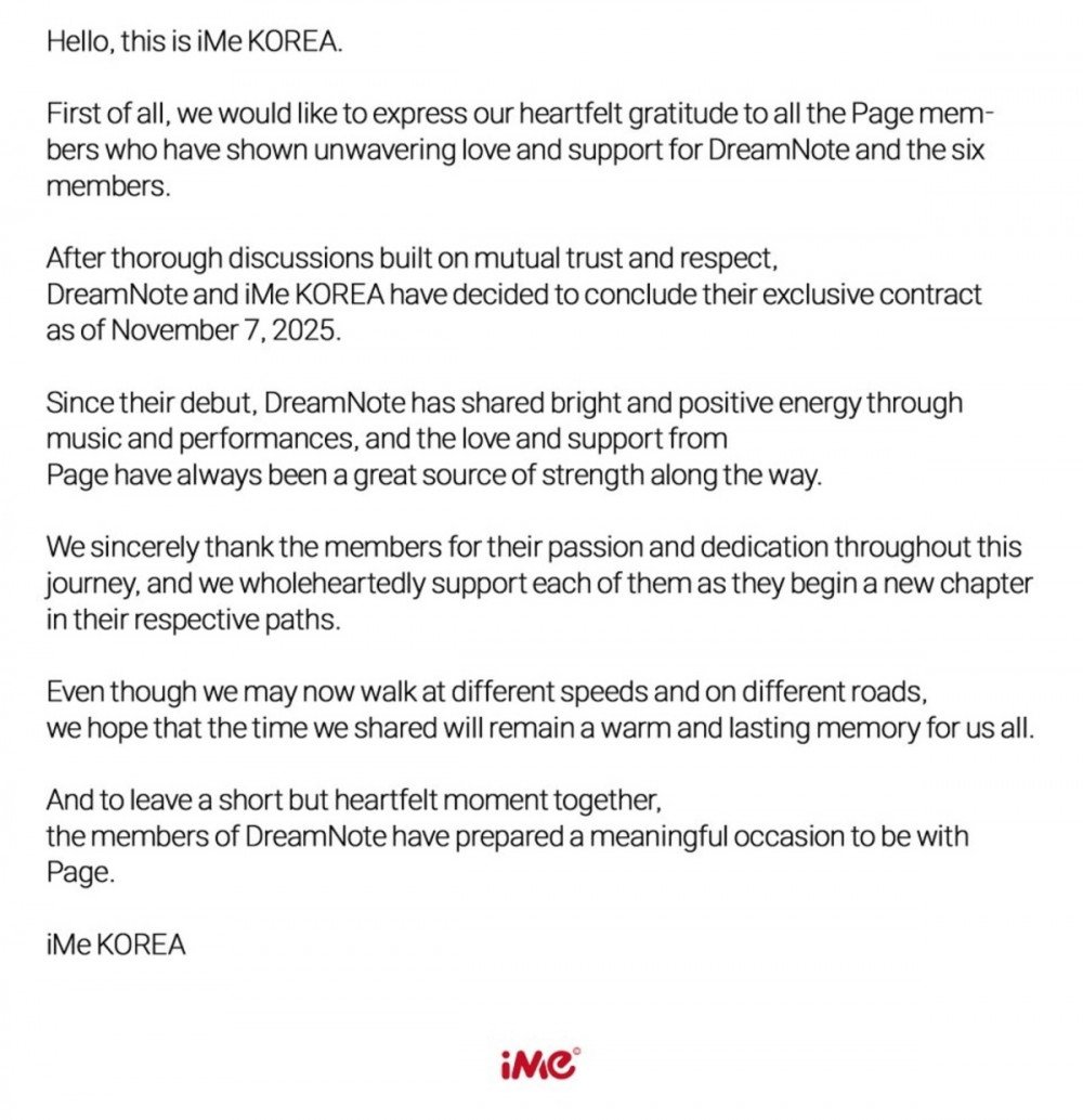 On October 22, iMe KOREA released an official statement confirming that DreamNote’s contract will expire on November 7, 2025. Following the expiration, the members will “begin a new chapter in their respective paths” and “walk at different speeds and on different roads.”