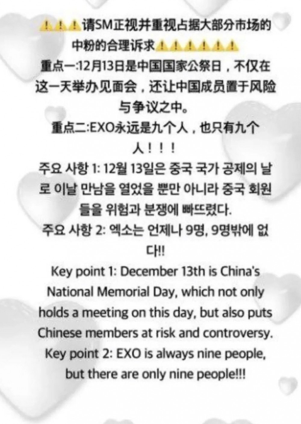 Adding to the controversy, the fan meeting is scheduled for December 13th and 14th—dates that coincide with China’s National Memorial Day. This timing effectively prevents Lay, EXO’s Chinese member, from attending, further fueling fans’ disappointment.