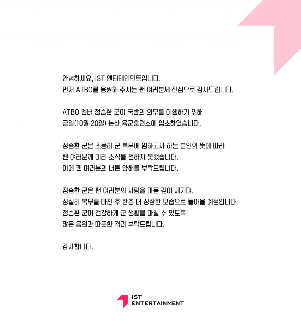 First, we sincerely thank all the fans who support ATBO. ATBO member Jeong Seunghwan today (October 20) entered the Nonsan Army Training Center to fulfill his mandatory military service.