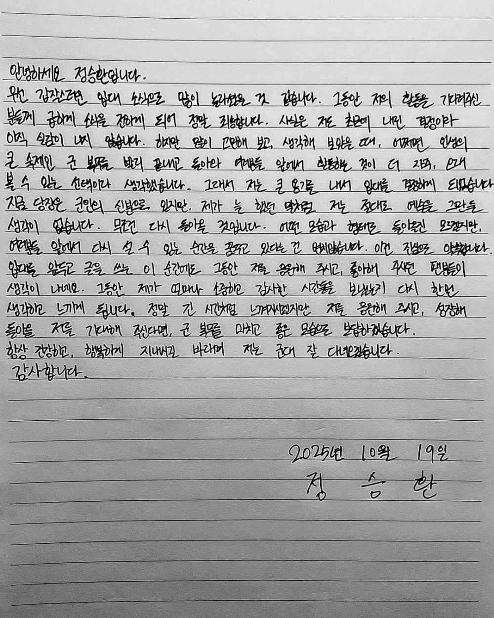 Jeong Seunghwan will deeply cherish the love of his fans, and after diligently completing his service, he plans to return with a more mature presence. We ask for your continued support and warm encouragement so that Jeong Seunghwan can complete his military life in good health."