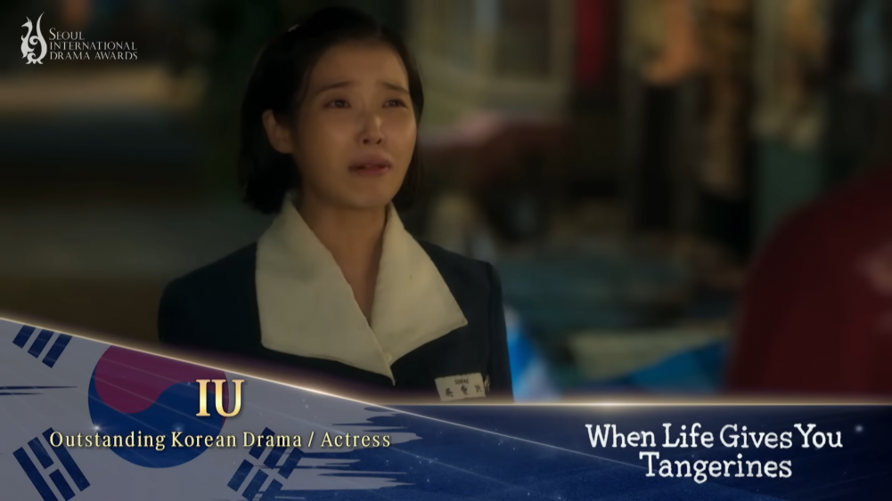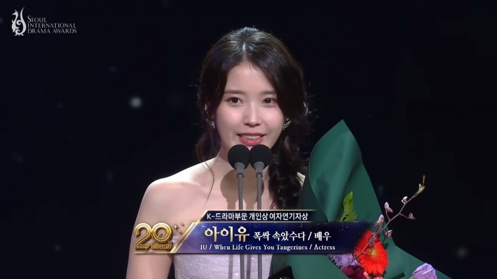 IU expressed her gratitude to the audience and judges with her characteristic calm and sincere voice. She began by saying, “Thank you to everyone who loved 'When Life Gives You Tangerines'.” She continued, “I dedicate this honor to writer Lim Sang Choon, director Kim Won Seok, and all the production staff who worked hard on set.”