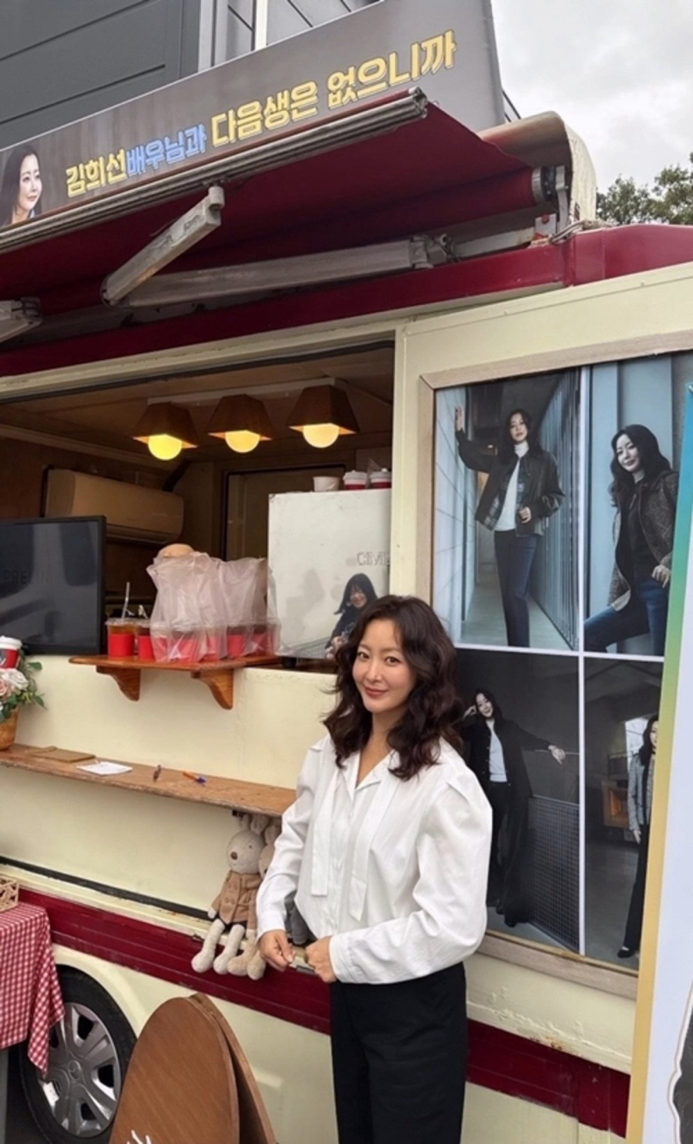 Along with the message, Kim shared several photos of herself smiling in front of a coffee truck sent to support the drama set. A banner on the truck read, “Supporting actress Kim Hee Sun and all the cast and crew of ‘There’s No Next Life.’”