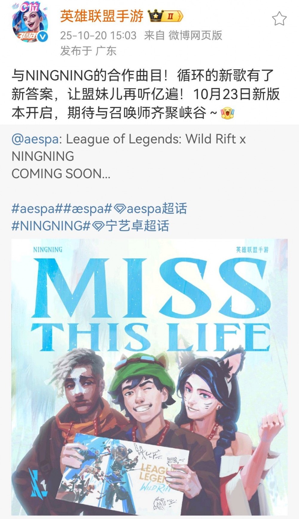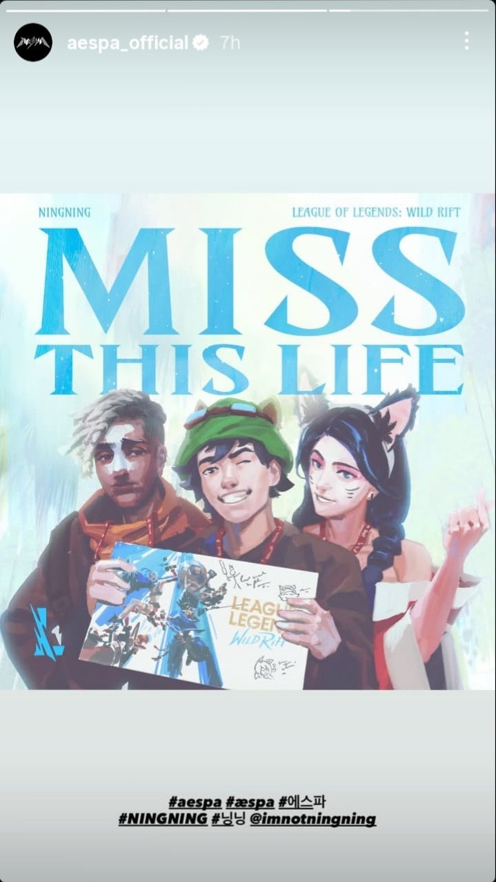 The announcement was shared by aespa’s official Instagram and Weibo accounts, as well as League of Legends’ official Weibo, accompanied by an illustrated teaser image that immediately caught fans’ attention. Interestingly, the release date coincides with NingNing’s birthday, making many fans even more excited and considering it a special gift for the idol.