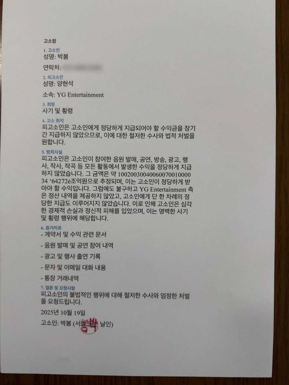 Earlier, on October 22, Park Bom posted on her social media account a photo of what appeared to be a lawsuit document against Yang Hyun Suk, alongside the caption, "From Park Bom." In the photo, the plaintiff’s name was written as “Park Bom,” while the defendant was listed as “Yang Hyun Suk.” Under the section for “charges,” the document read “fraud and embezzlement.”