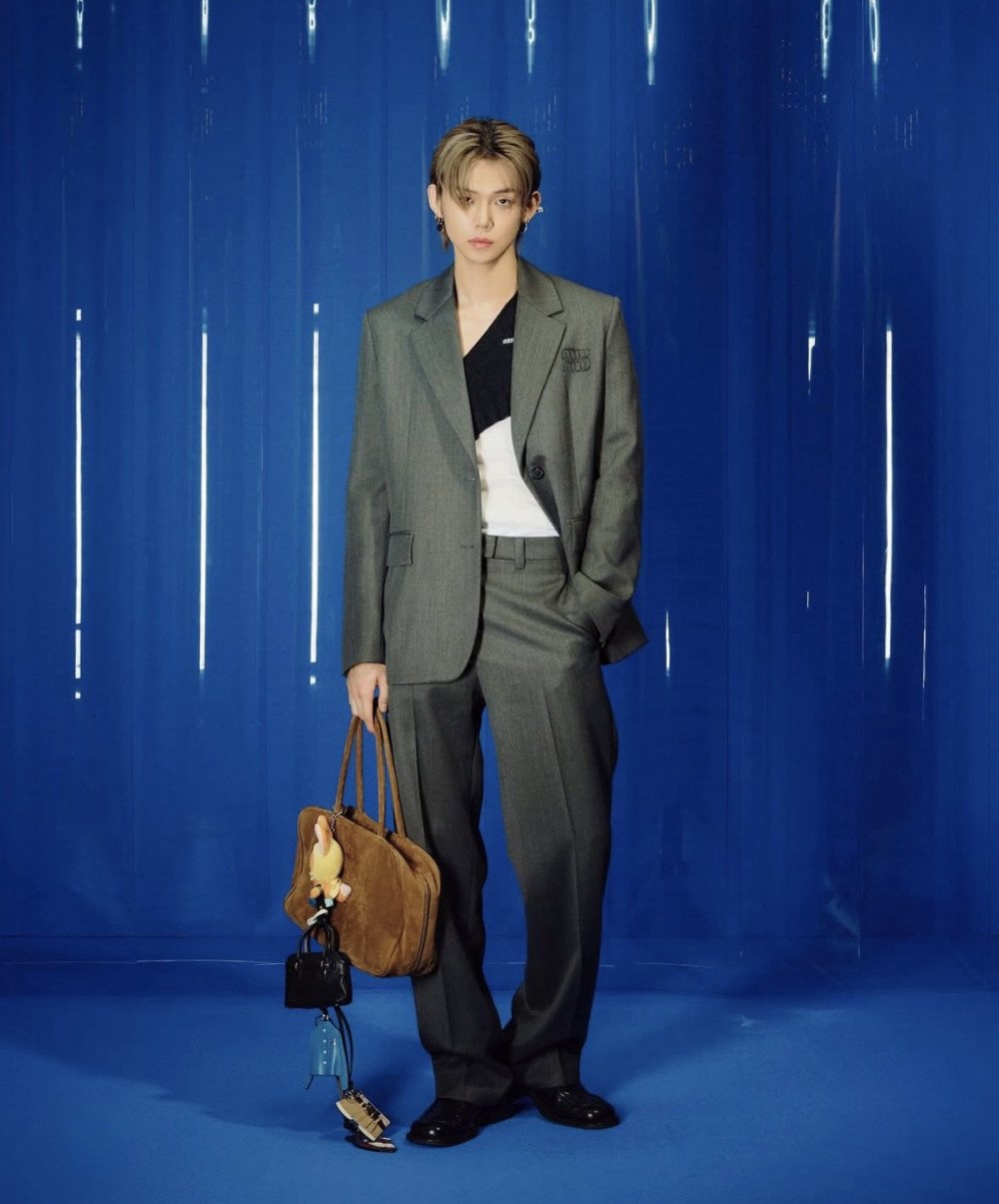 Yeonjun exuded effortless luxury in a mohair suit-style jacket and straight-fit trousers, topped off with Miu Miu’s iconic suede bow bag, adding a sharp, modern edge.