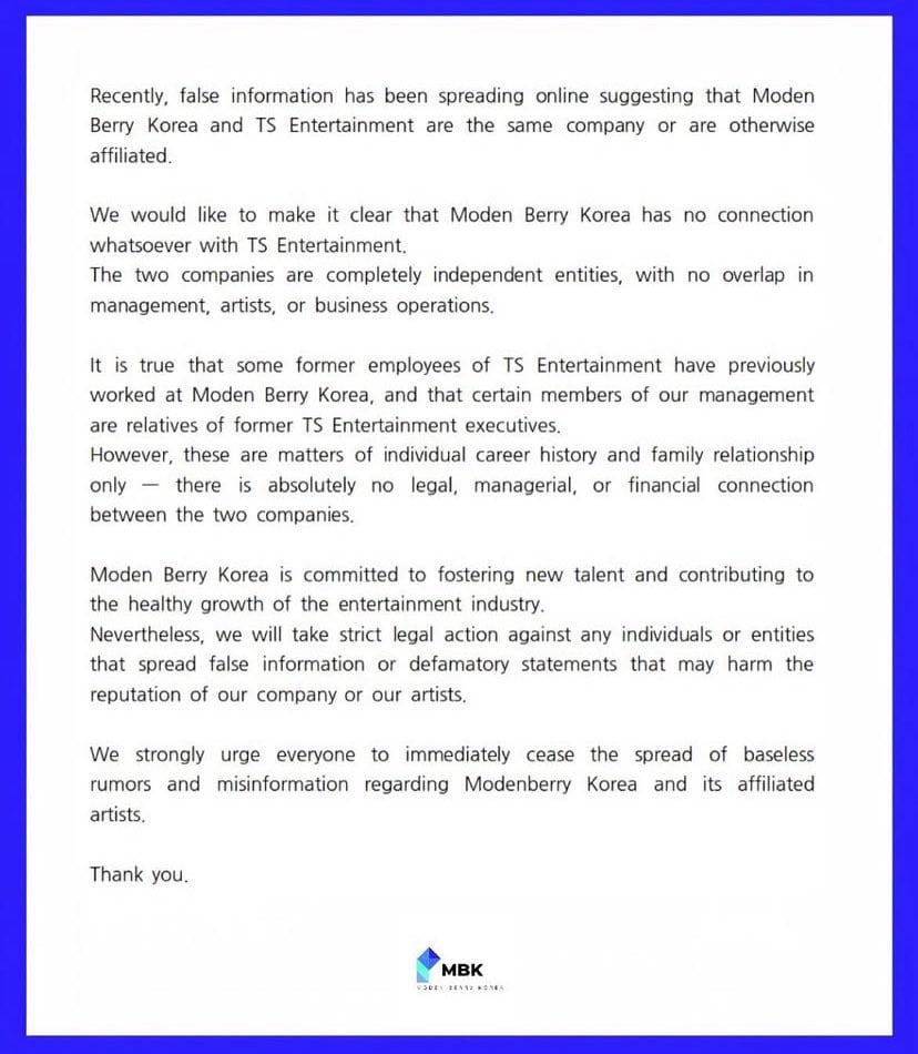 Moden Berry Korea have released a statement denying their ties to TS Entertainment and threatened legal action to those that are spreading misinformation.