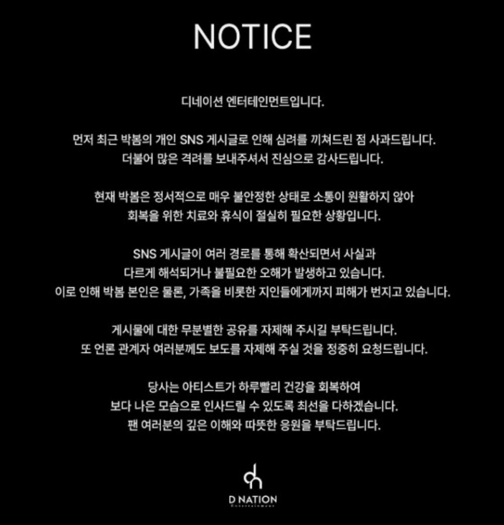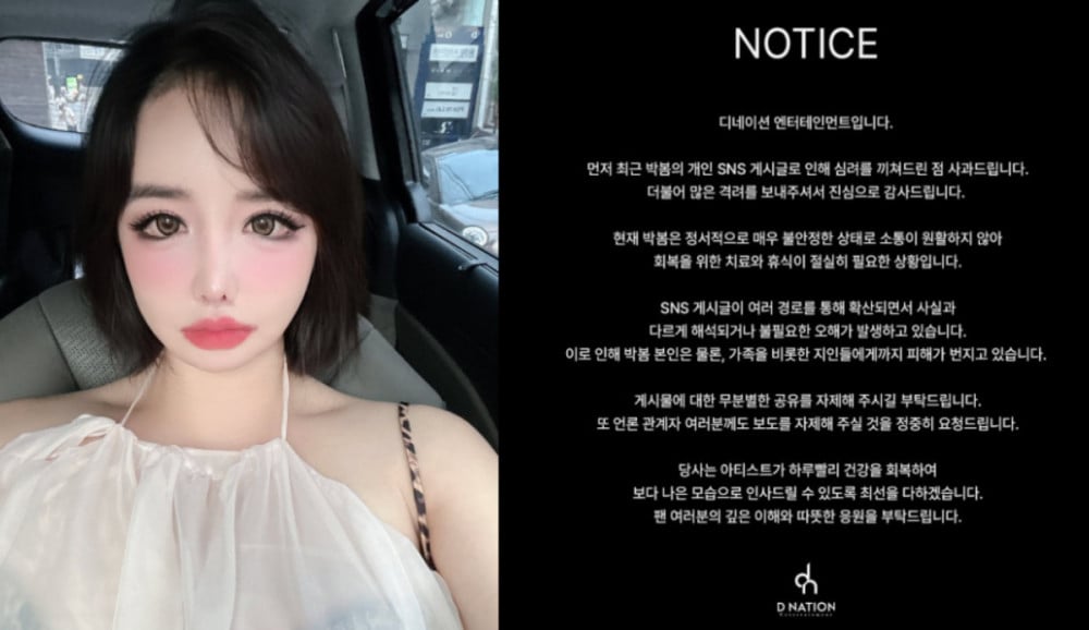 The agency requested that fans and media outlets refrain from sharing or reporting on the post further to prevent additional misunderstandings. “Our company will do our utmost to help the artist recover her health as soon as possible and return in a better state. We kindly ask for fans’ understanding and continued warm support,” D-NATION concluded.