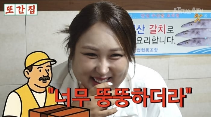 In a recent episode of 'Repeat Restaurant' uploaded to the 'Studio Suje' channel, Poongja visited a restaurant recommended by a local merchant, known for its braised cutlassfish and grilled mackerel. After placing her order, Poongja cheerfully asked the customers at the next table, "Mothers, how many times have you come here?"