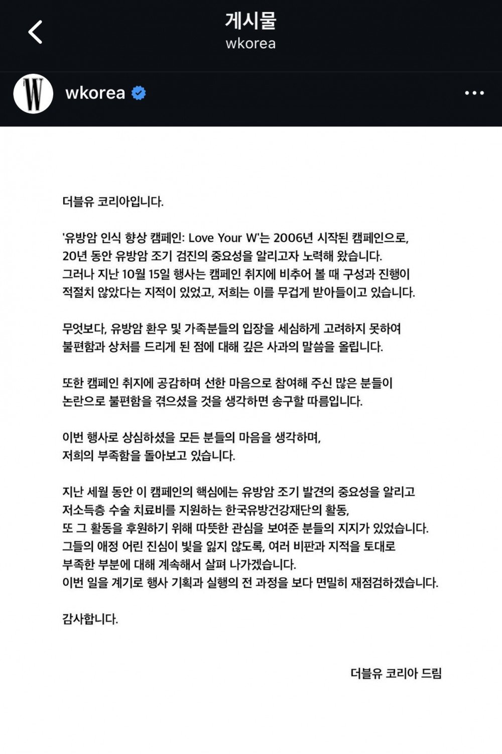 ‘Love Your W’ is a breast-cancer awareness campaign launched in 2006. For 20 years, we have worked to promote the importance of early screening. However, we recognize that the Oct. 15 event drew criticism that its composition and execution were not appropriate in light of the campaign’s purpose, and we take this seriously.