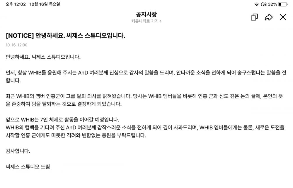 On October 16, the group’s agency C-JeS Studio released an official statement on WHIB’s fan community, announcing member Inhong’s decision to leave the group.