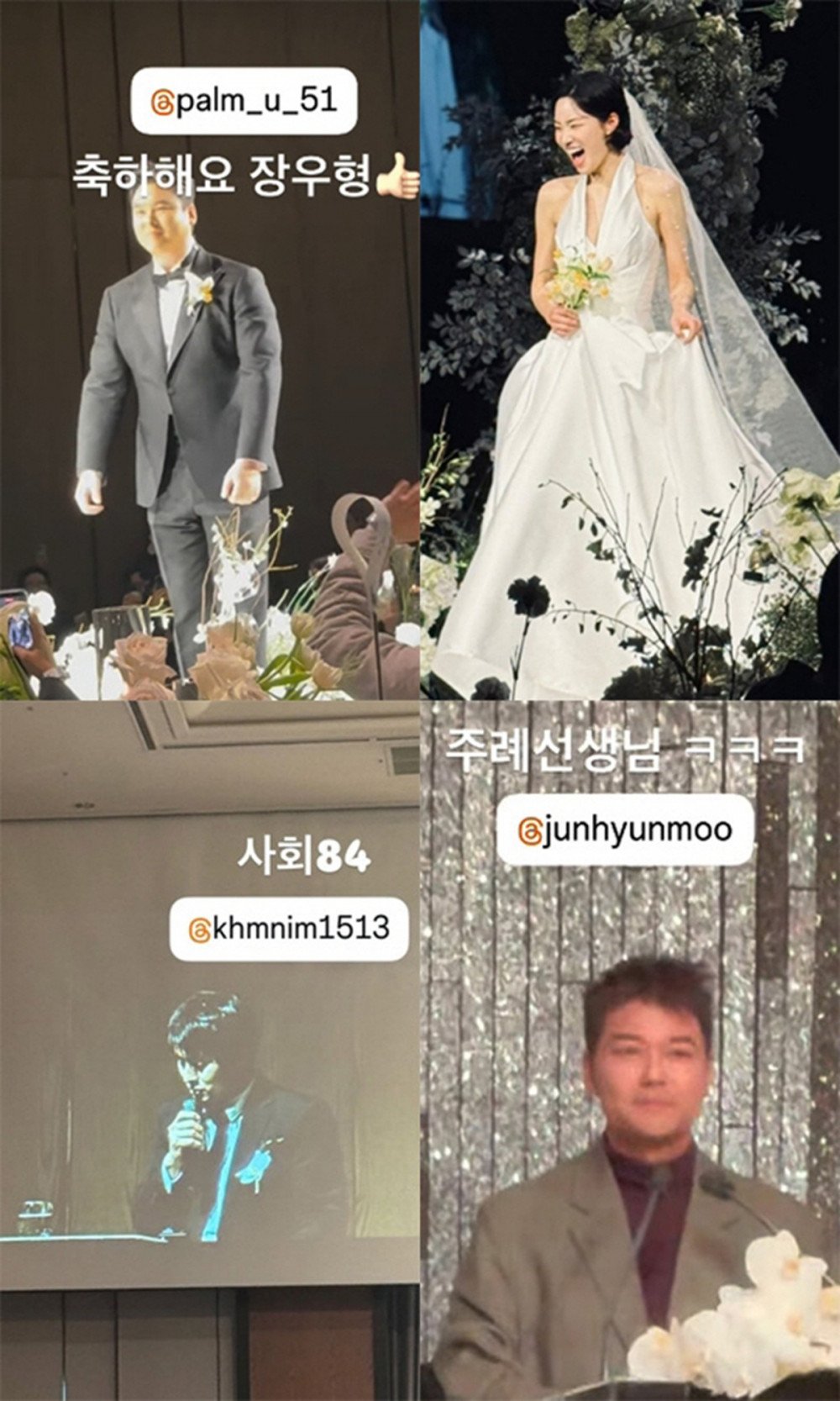 Guests shared glimpses of the joyful event on social media. Baseball player Hwang Jae Gyun posted photos of Jun Hyun Moo at the podium and Kian84 hosting. He also shared a video of the groom, Lee Jang Woo, making a hilarious and energetic entrance to the 'Kung Fu Panda' OST, "Kung Fu Fighting," drawing laughter and cheers from the crowd.