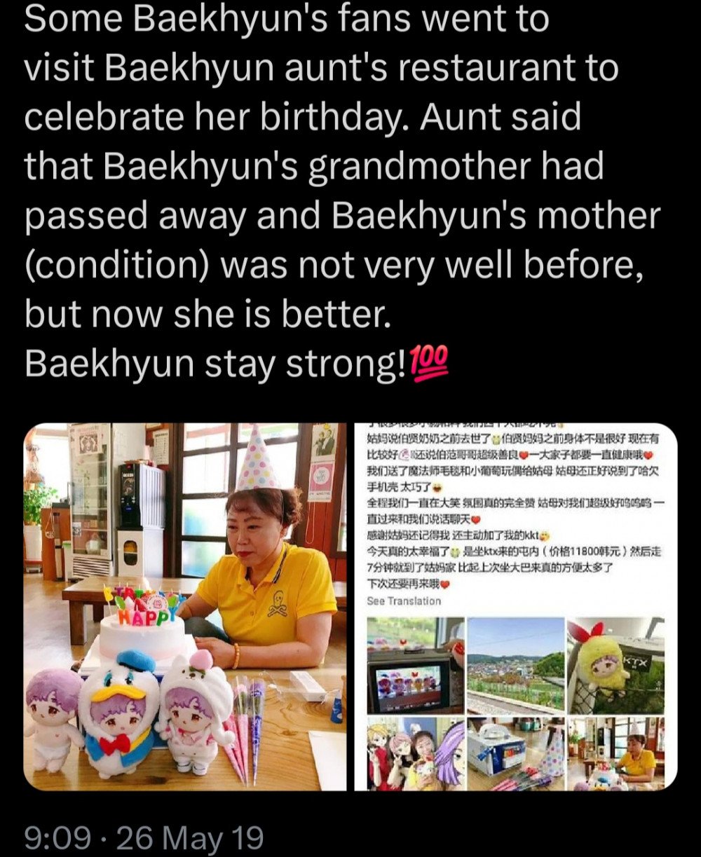 In 2019, fans who visited Baekhyun's aunt's restaurant for her birthday shared a significant family detail: his grandmother had reportedly passed away that year. The aunt also mentioned that Baekhyun's mother was dealing with some health issues at the time, but was recovering.