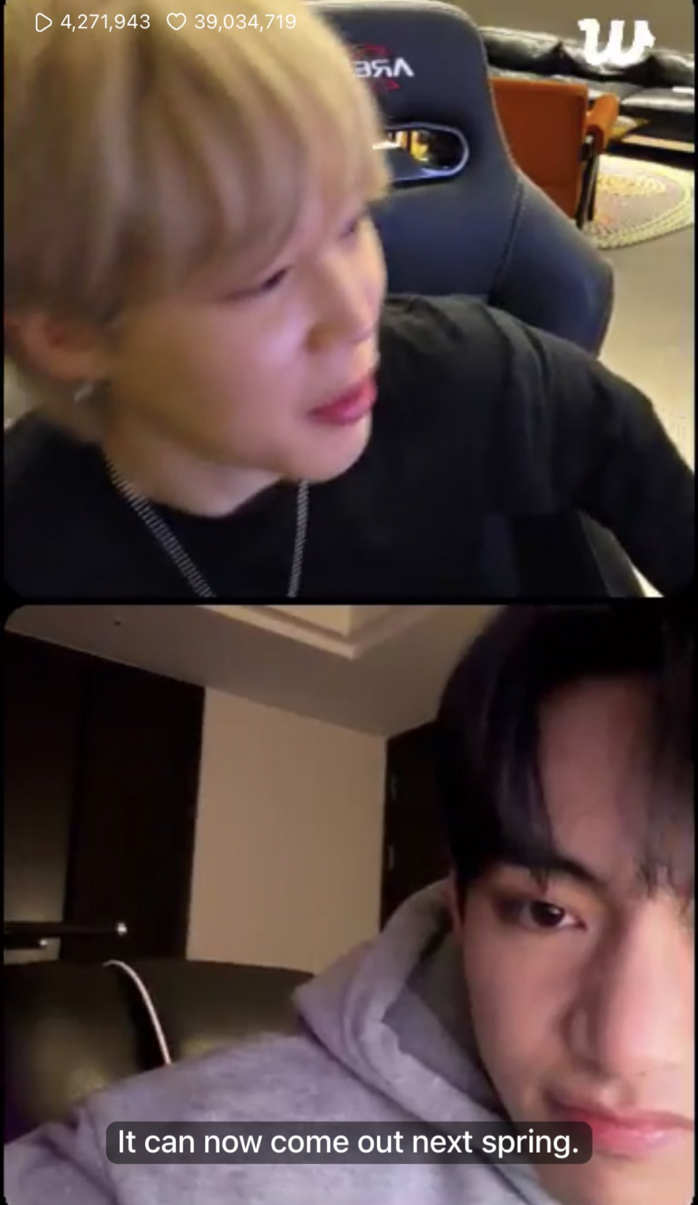 On November 1, Jimin held a surprise WeVerse livestream to chat with fans. V also made a special guest appearance, as the two updated fans on their lives.
