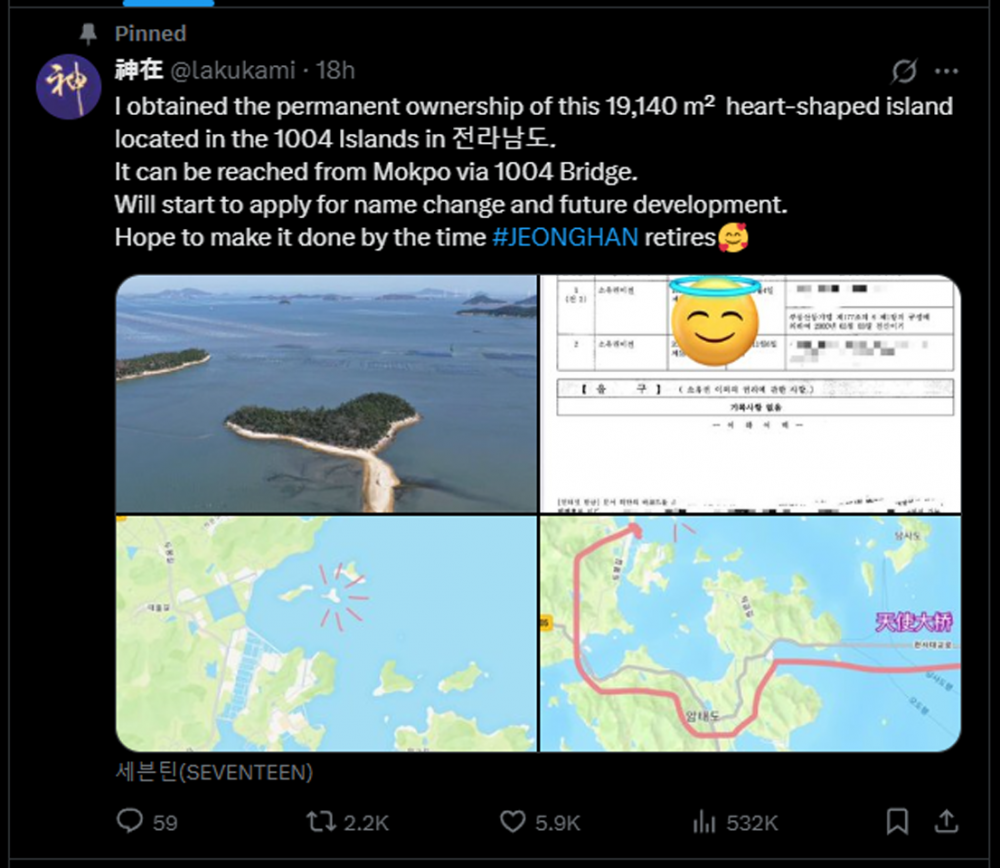 The fan, known by the handle @lakukami on X (formerly Twitter), shared what appears to be a land deed asserting ownership of the island. According to their posts, the island spans 19,140 square meters and sits among the turquoise waters of the famed “1004 Islands” in Jeollanam-do, near Mokpo. The location is accessible via the region’s well-known 1004 Bridge, which links many of the area’s small islands.