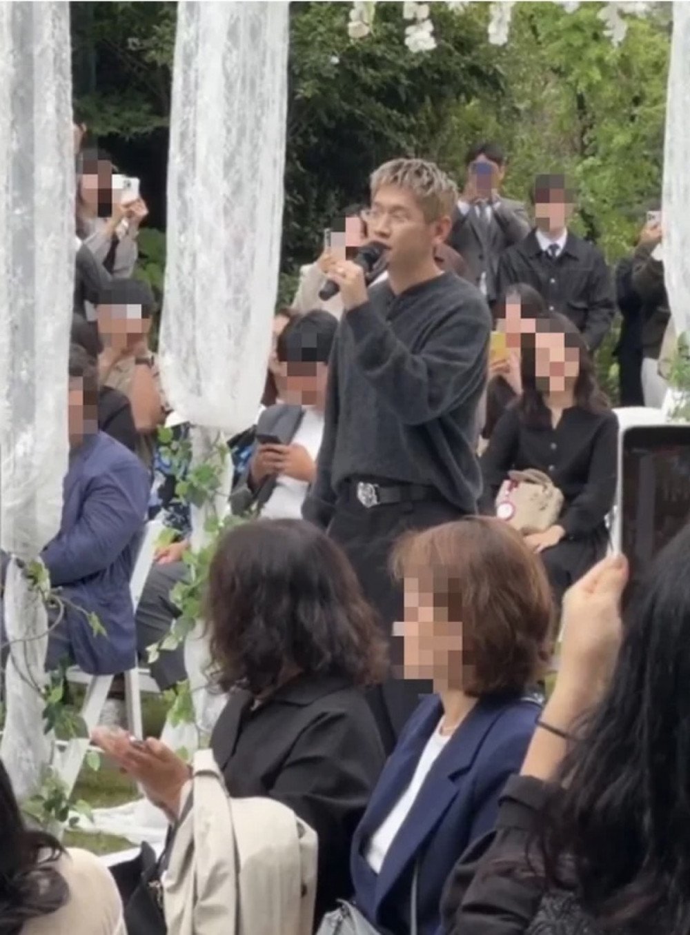 Recently, a post titled “Look at Crush Singing at Joy’s Sister’s Wedding” appeared on an online community. The post included photos taken at the wedding ceremony held on October 19 KST, showing Crush holding a microphone and performing a heartfelt song among the guests.