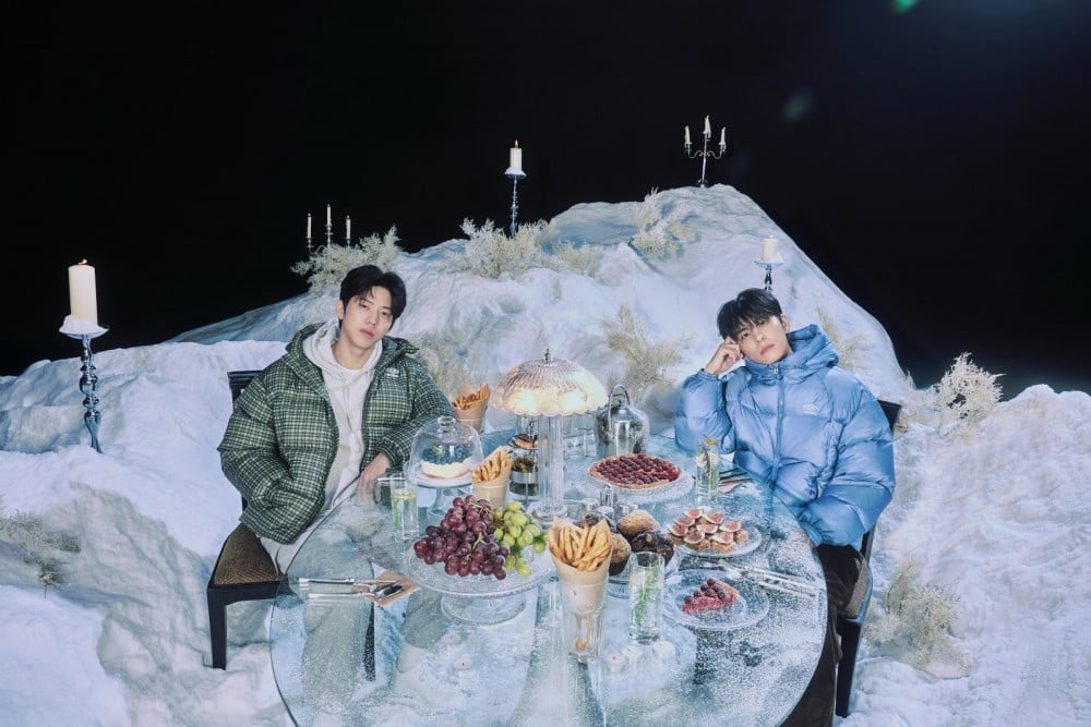 Under swirling snowflakes, DAY6 modeled a range of pieces from light to heavy down jackets, exuding both warmth and effortless style.