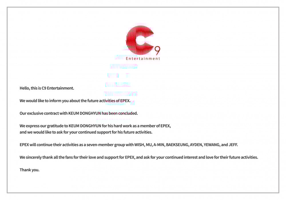 On November 21, EPEX’s agency C9 Entertainment announced that their exclusive contract with Keum Donghyun has concluded and that he will be leaving the group. As a result, EPEX will continue their activities as a seven-member team moving forward.