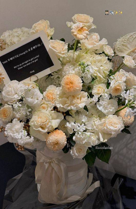 Having first connected while filming the APEC spot, G-Dragon added to the fun with a note — “We’re up all night to get Lucky! Show ’em what you’ve got!” — and even a bit of wordplay on IVE’s ‘XOXZ’, stylized as “Xoxg.” Jang Won Young tagged G-Dragon in a thank-you post along with the bouquet shot.