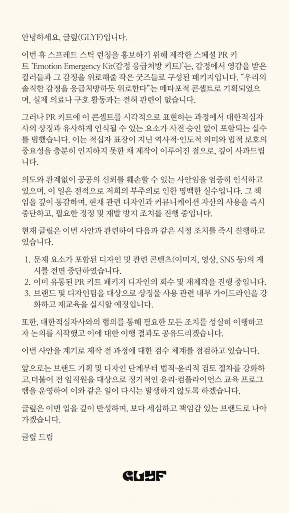 On November 6, GLYF released a statement through its official social media channels, acknowledging the mistake:“In the process of visually expressing our special PR kit, ‘Emotional First Aid Kit’, designed to promote the launch of our new Hugh Spread Stick, we made an error by including elements that could be perceived as similar to the emblem of the Korean Red Cross.”