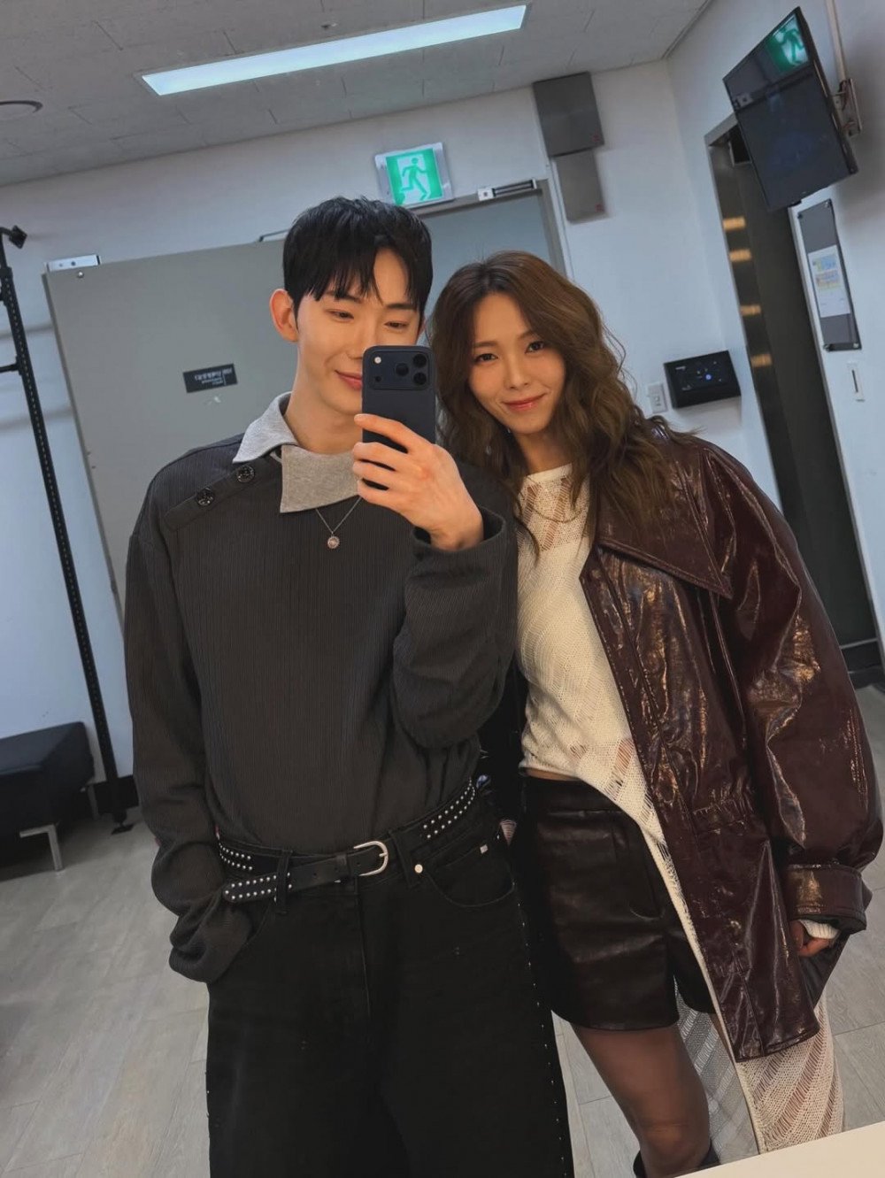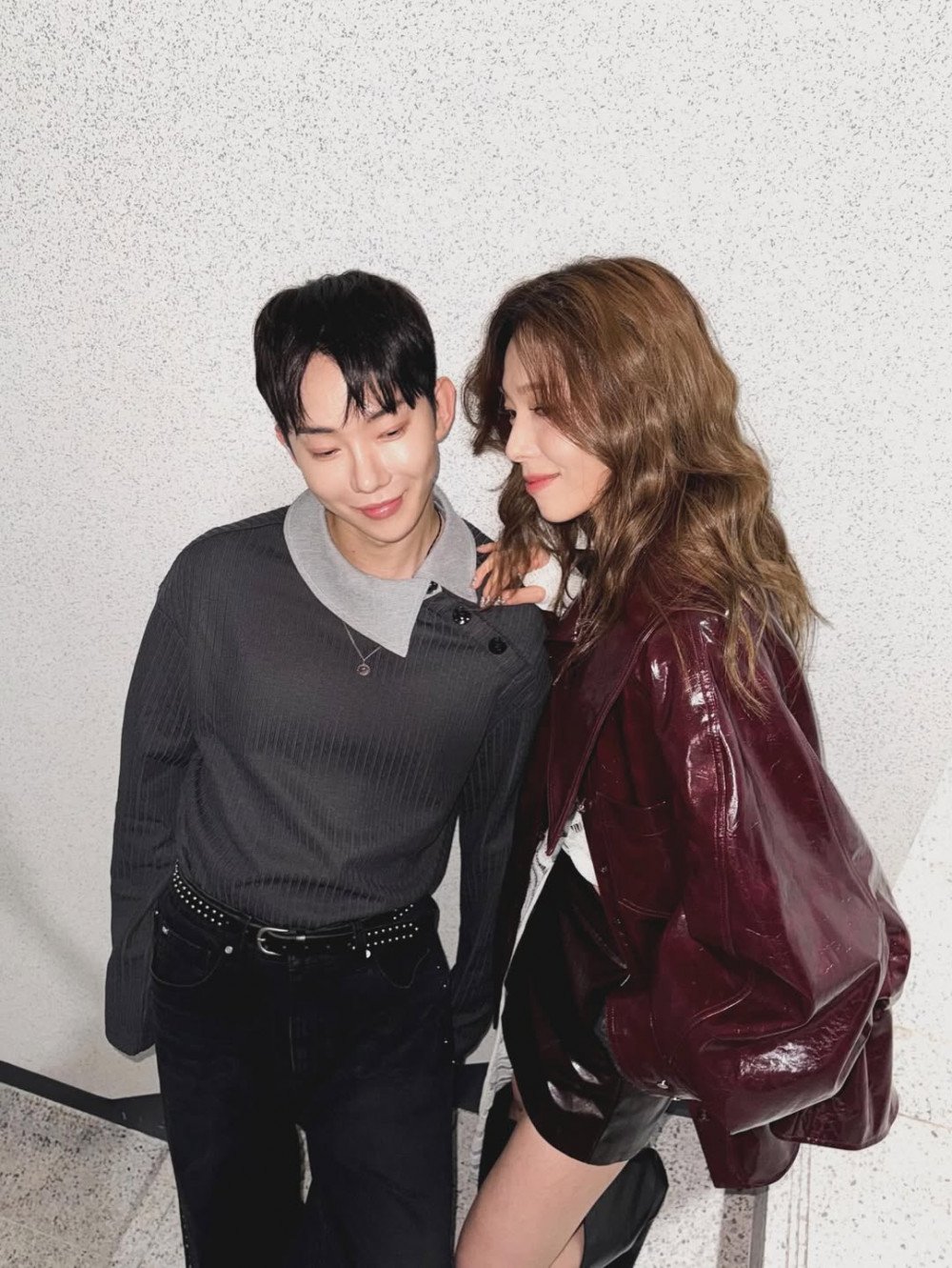 Beside him, former Wonder Girls member Sunye stands smiling toward the camera. Her long, subtly wavy hair flowed naturally, adding soft volume that emphasized her mature charm. She layered a glossy dark leather long coat over a white knit top, pairing it with black shorts to complete a chic look. Leaning slightly toward Jo Kwon, her posture conveyed the deep trust between longtime friends and colleagues, while her relaxed smile suggested anticipation rather than nerves ahead of performing.