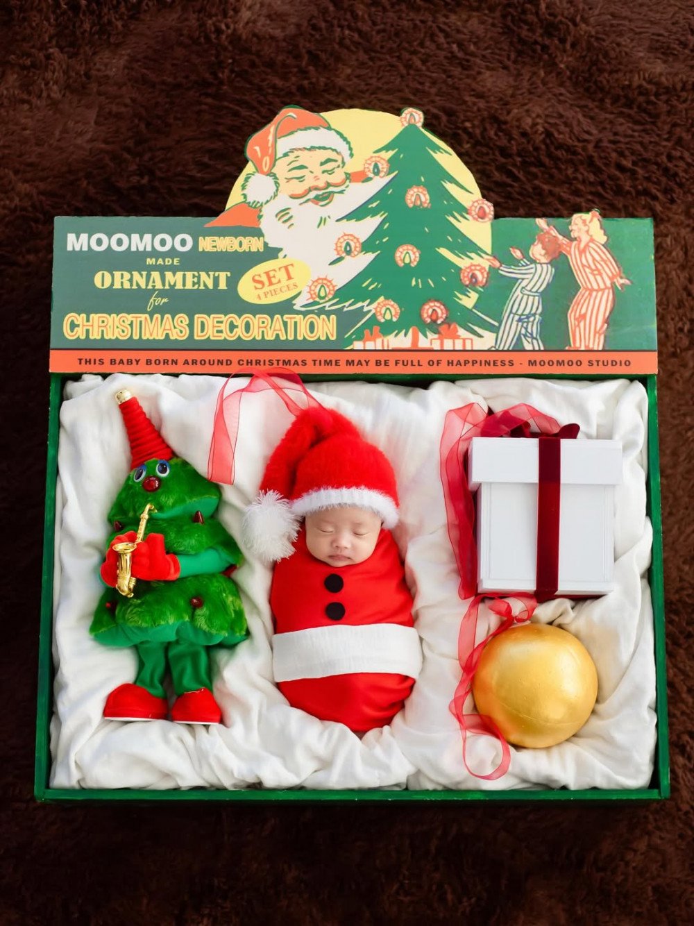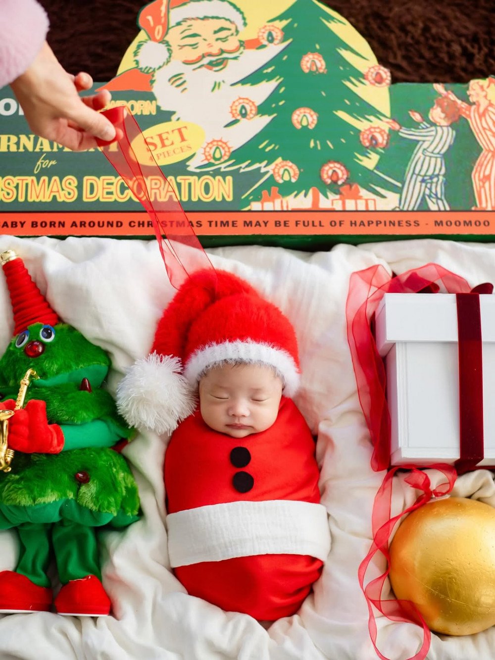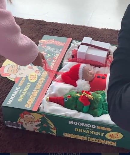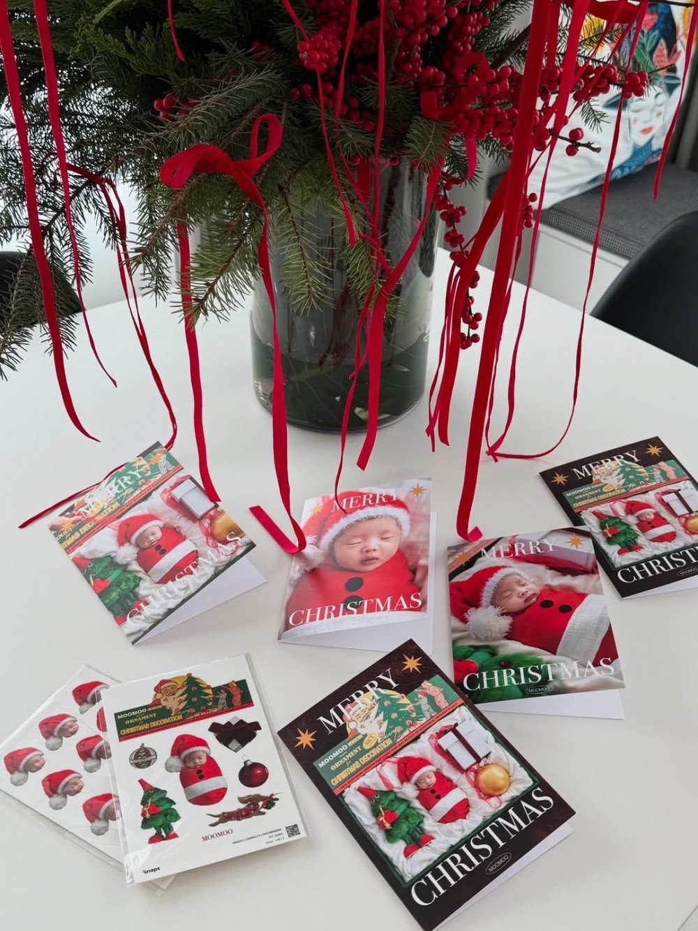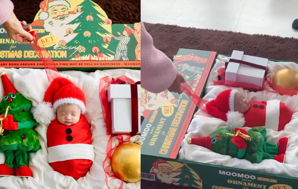 The photos show Lee Si Young’s newborn daughter dressed in a Santa hat and outfit, posed among Christmas ornaments, a tree, and gift boxes as part of the completed 'born art' shoot. These images were also made into cards and framed pieces, which could be seen displayed throughout her home.
