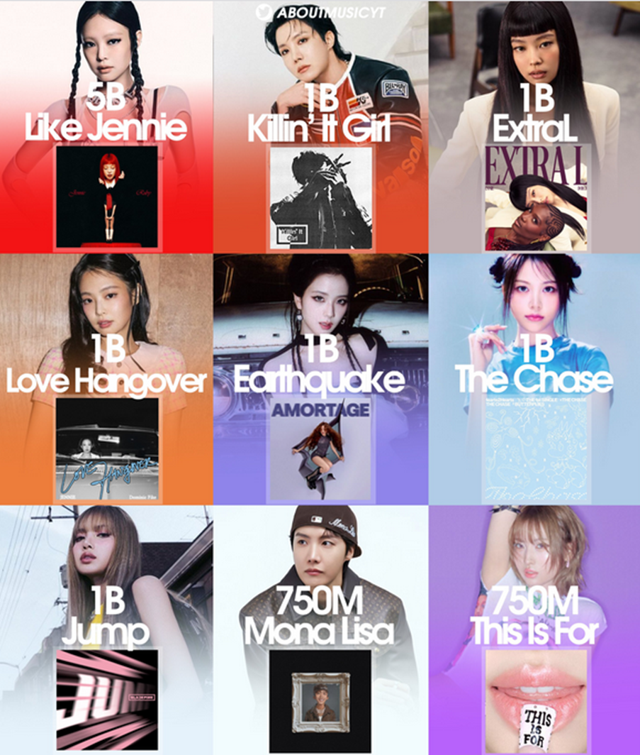 According to statistics pages, Jennie's smash hit became the most used K-pop audio of the year on TikTok by a landslide, thanks to its massive popularity and widespread use in dance challenges, runway edits, and concert clips. At the same time, her songs "Extral" and "Love Hangover" have each amassed over 1 Billion views, ranking second among the most-viewed K-pop songs on TikTok this year, tying with the global hits "Jump" by BLACKPINK and "Earthquake" by Jisoo. This tie also occurred with songs from other companies, such as "Killin' It Girl" by J-Hope with GloRilla and "The Chase" by Hearts2Hearts.