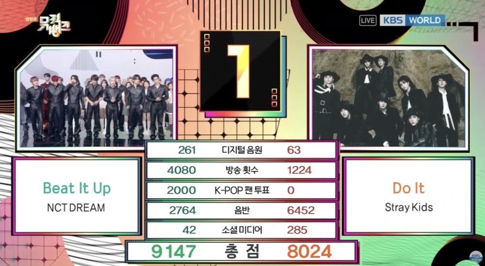 On this week’s broadcast, NCT Dream’s "Beat It Up" and Stray Kids’ "Do It" went head-to-head as the two 1st-place nominees. NCT Dream ultimately clinched the win with a total of 9,147 points, while Stray Kids followed in 2nd place with 8,024 points.