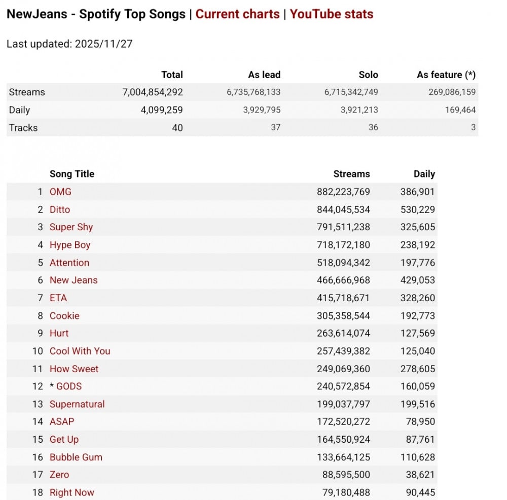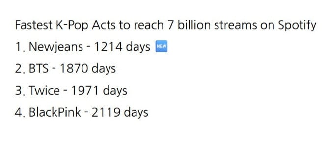 This comes as Newjeans officially surpasses BTS' record as the fastest kpop group to reach 7 billion streams on spotify in record time at 1214 days versus the previous record held by BTS at 1870 days.
