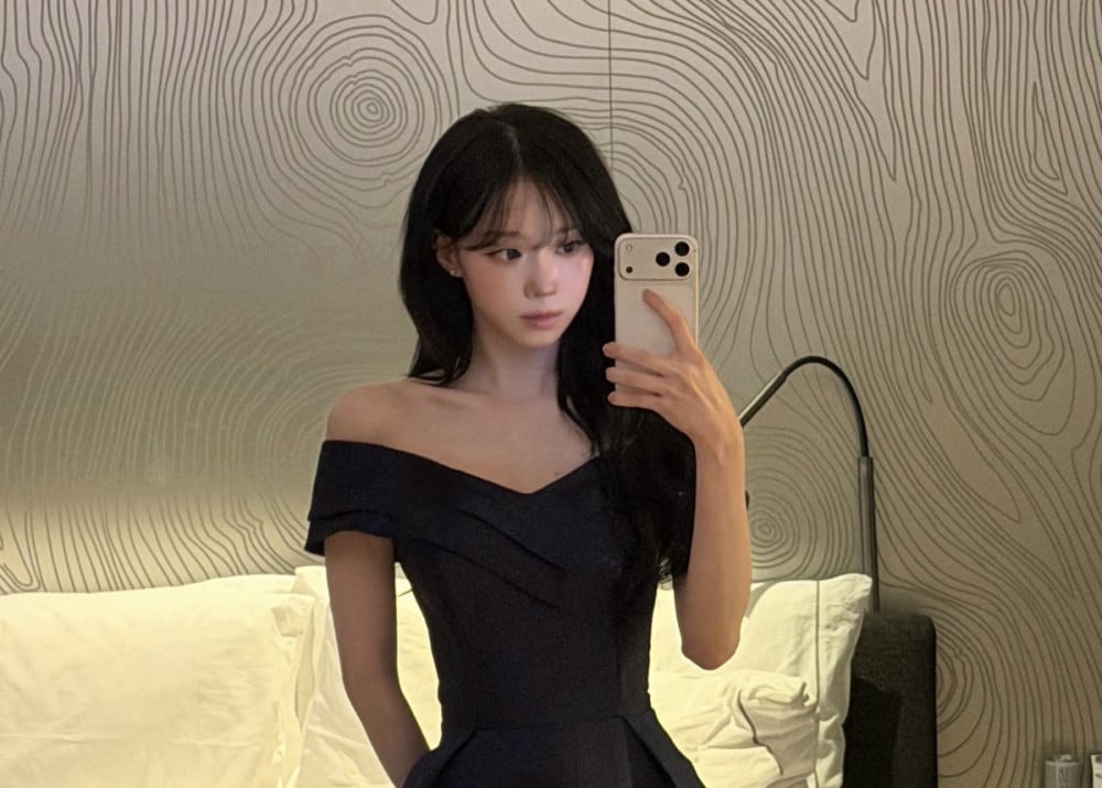 On December 16 KST, Winter posted two photos on the fan communication platform Bubble along with a short message that read, “Good night.” In the photos, Winter is seen taking a mirror selfie while wearing an off-shoulder dress, showing off her princess-like visuals.