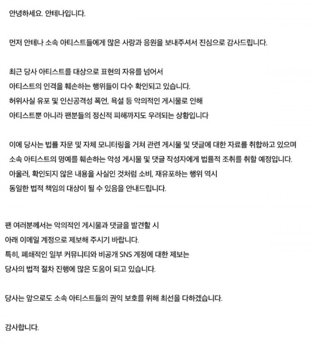 Antenna stated that it has confirmed multiple cases involving the spread of false rumors, personal attacks, insults, and other malicious content, which the company described as severe enough to potentially cause psychological harm not only to the artists but also to their fans.