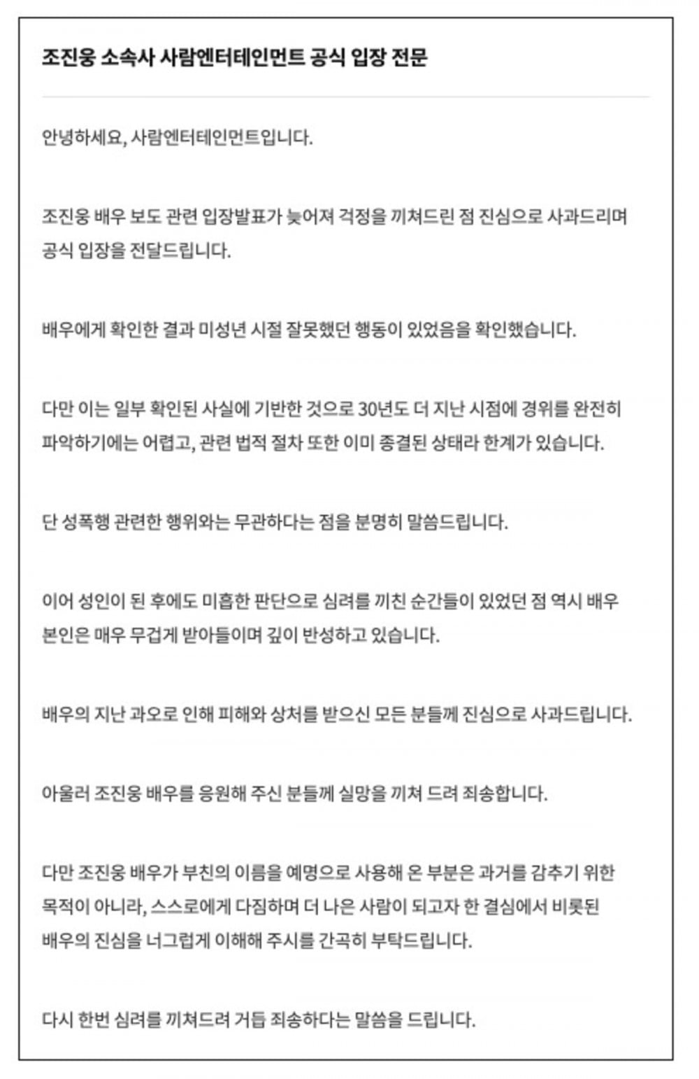We offer our sincere apologies to everyone who suffered harm or was hurt due to the actor’s past wrongdoings. We also apologize to those who have supported Cho Jin Woong for the disappointment he has caused.