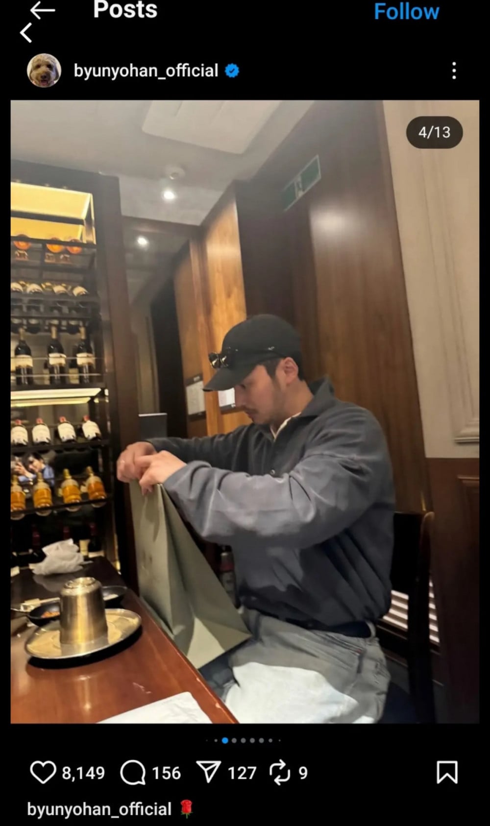 Right around May of this year, Byun Yo Han shared some photos from his birthday celebration. Then, in one photo, fans quickly noticed a woman reflected in the mirror behind the wine shelves.
