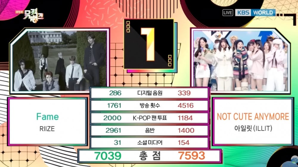 On the December 5 episode of KBS 2TV’s 'Music Bank,' the nominees for first place were RIIZE’s “Fame” and ILLIT’s “NOT CUTE ANYMORE.” With a total of 7,593 points, ILLIT ultimately secured the top spot, marking a meaningful milestone in their comeback promotions.