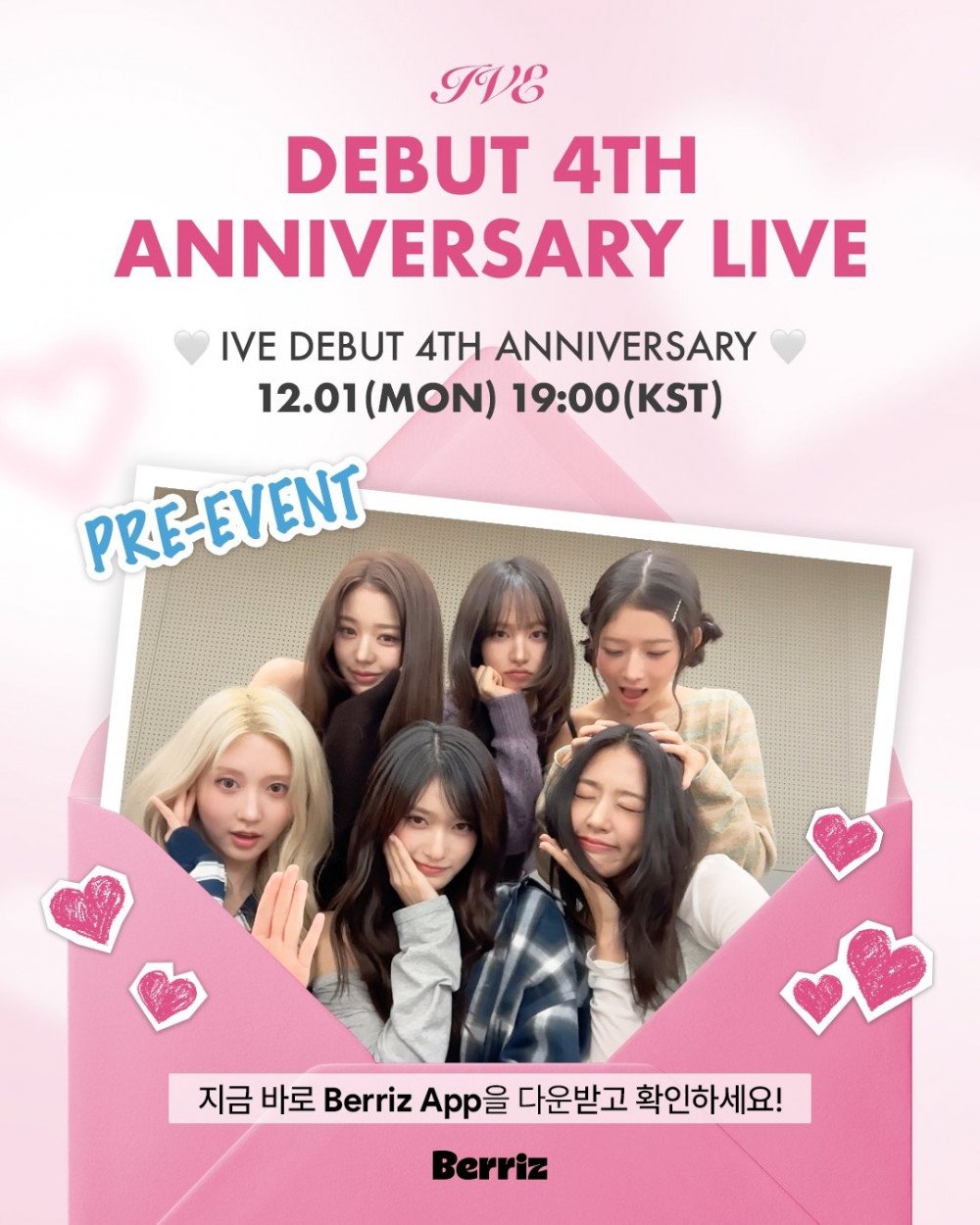 According to the fan platform Berriz, the group will host a special live broadcast titled ‘♡IVE DEBUT 4TH ANNIVERSARY♡’ at 7 PM KST through their official fan community on the app. During the stream, IVE will look back on their nonstop journey over the past four years and answer congratulatory messages and questions sent in by DIVE (their official fandom).