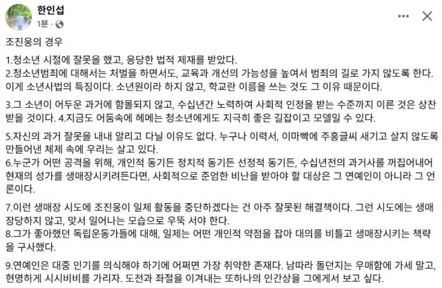 On December 7, 2025, at approximately 12:11 AM KST, Han In Sup posted on Facebook sharing his views on juvenile justice, noting that Cho Jin Woong's misconduct occurred during adolescence and was revealed decades later.