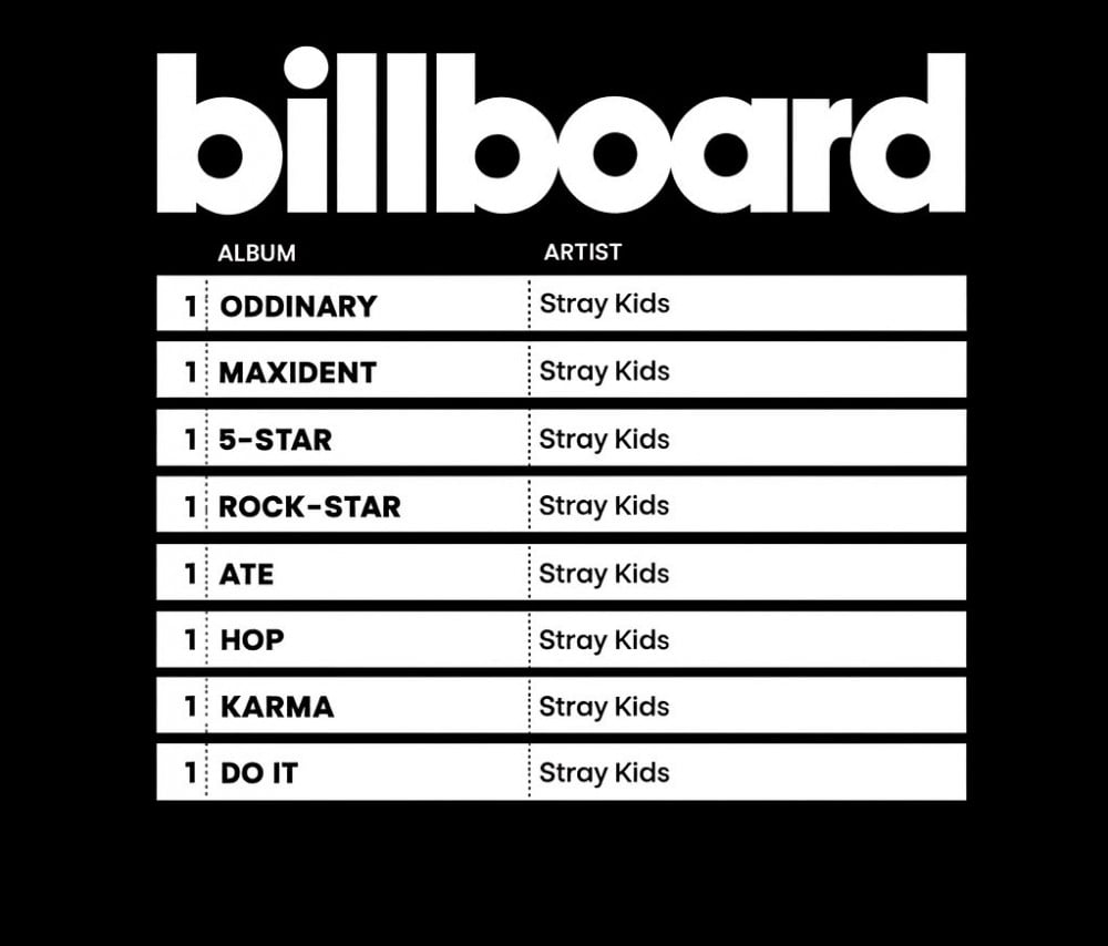 With their latest win, Stray Kids extend their lead as the group with the most Billboard 200 No. 1 albums this century. They now join The Beatles,The Rolling Stones and Led Zeppelin as the only groups in history to have at least eight #1 albums on the Billboard 200.