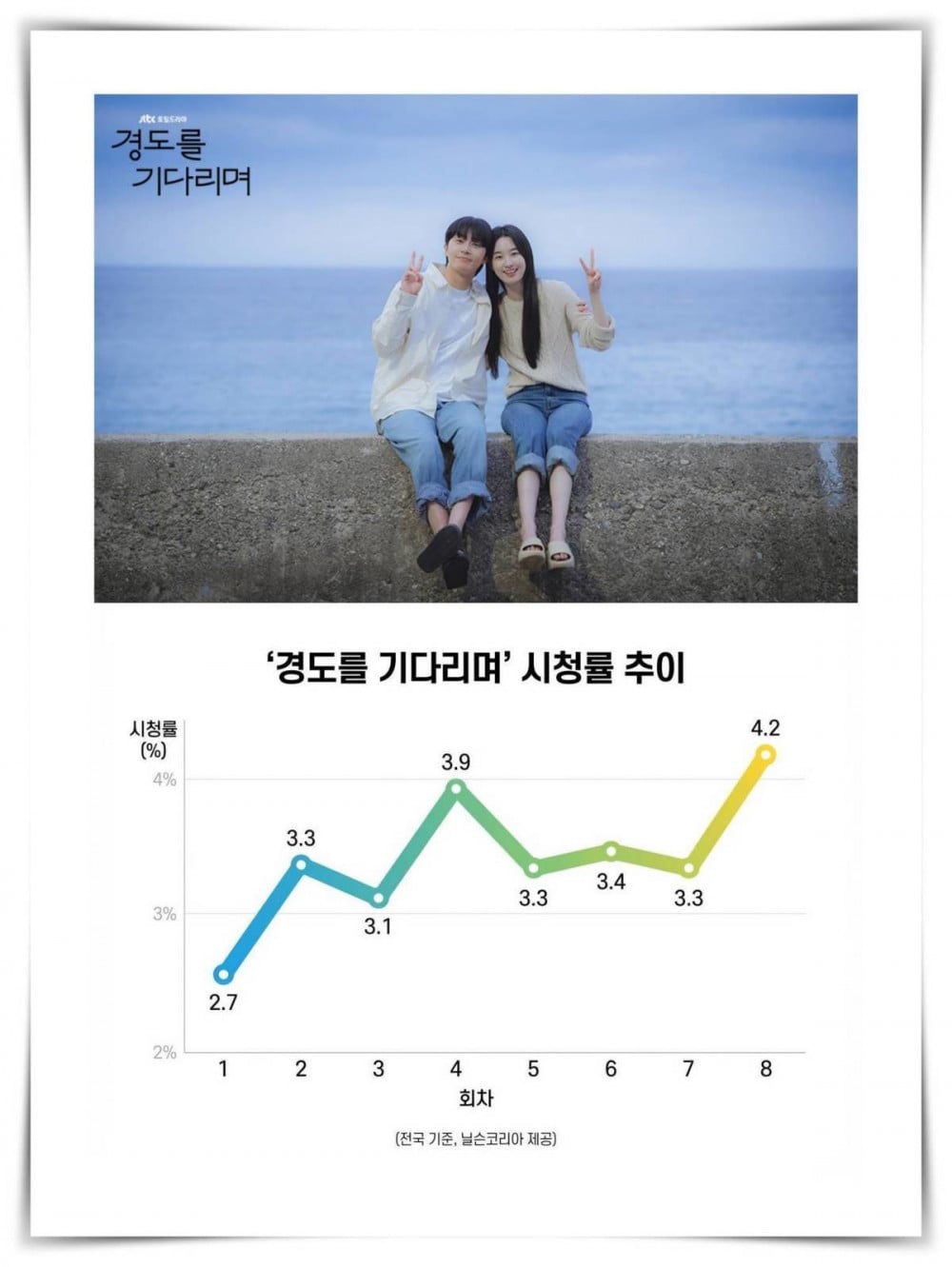Rather than a sudden spike, the show’s ratings growth has been cumulative. Nationwide viewership rose from 2.7 percent in Episode 1 to 3.3 percent in Episode 2, climbed to 3.9 percent by Episode 4, and peaked at 4.2 percent in Episode 8. In a competitive time slot, the drama has maintained a stable upward trajectory.