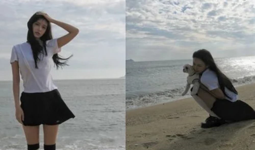 In the photos, Cheng Xiao stands on a sandy beach with the sea in the background. Gently holding her wind-blown hair, she completed a fresh, school-look style with a white T-shirt, black skirt, and knee-high socks. Her natural poses and bright atmosphere combined to highlight her refreshing charm.
