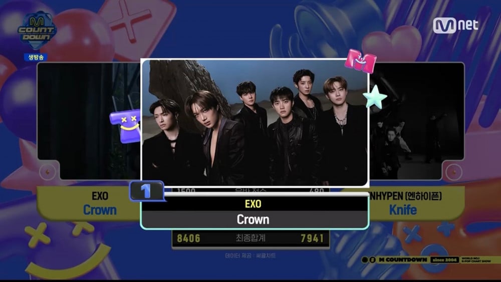 On the January 29th broadcast of Mnet’s 'M! Countdown,' EXO’s "Crown" and ENHYPEN’s "Knife" were nominated for first place. After the scores were tallied, EXO came out on top with a total of 8,406 points.