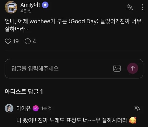 The following day, IU took to the global fan platform Berriz to wish her fans, UAENAs, a happy new year. During her visit, IU replied to a fan asking if she had watched Wonhee’s cover of “Good Day,” to which she responded, “I saw it!! Both her singing and her facial expressions were really great 🥰.”