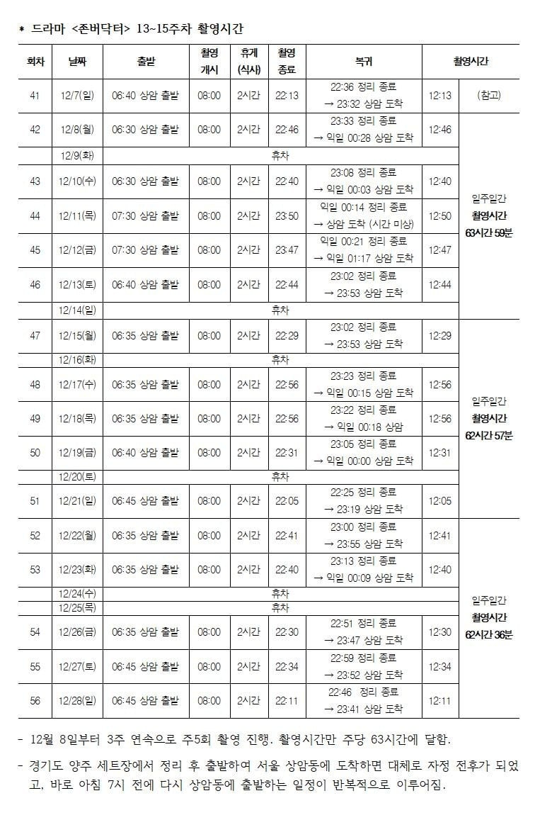Filming for ‘Johnber Doctor’ began in September last year. During its second week (September 22–28) and sixth week (October 20–26), the production carried out five filming sessions per week, with filming hours alone exceeding 55 hours. From December 8, the drama reportedly filmed five sessions per week for three consecutive weeks, totaling approximately 63 hours per week.