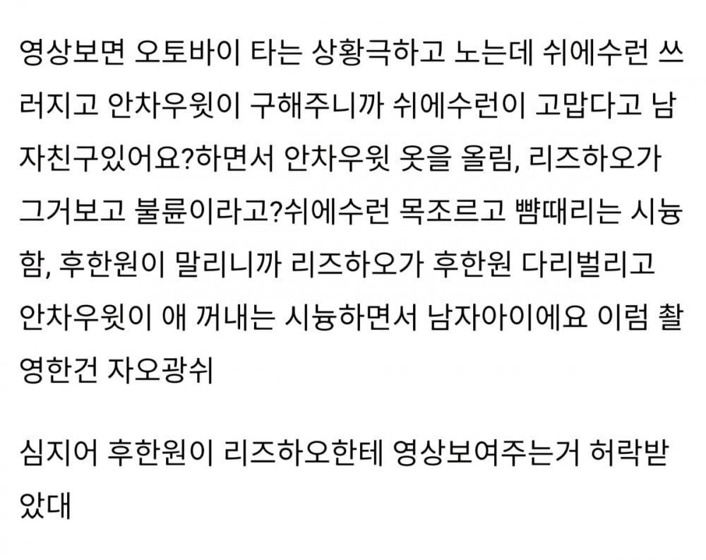 "They were first enacting a scene riding a motorcycle. Xue Suren fell over, and Ngan Chauyuet saved him, so Suren thanked him and asked him if he had a boyfriend while lifting up Chauyuet's clothes. Li Zihao then accused him of cheating and acted like he was slapping Suren in the face and strangling him. Hu Hanwen (a fellow contestant from 'Planet C'), who was lying down, tried to stop them, and then Zihao spread Hanwen's legs and Chauyuet acted like he was pulling out a baby from underneath and said 'It's a boy!'. Zhao Guangxu filed the whole thing."